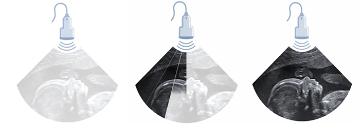 In Ultrasound, the transducer emits high-frequency sound waves. These waves, as they propagate through organs, will be reflected then processed and analyzed to create the image.