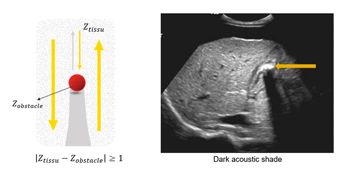 The greater the difference in acoustic impedance between two adjacent tissues, the more ultrasound energy will be reflected at the boundary. The acoustic shadow occurs when the sound wave meets a very dense structure. Almost all the sound is reflected, resulting in an acoustic shadow. Shading can occur due to intense reflectors such as calcification, air, or bone.