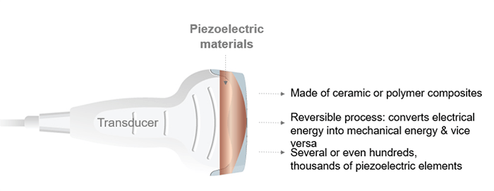 Piezoelectric materials are made of ceramic or polymer composites characterized by the reversible process, which converts the mechanical energy into electrical energy and vice versa. A transducer is composed of several or even hundreds or thousands of piezoelectric elements.