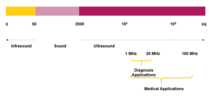 Here you can find the frequency scale of infrasound, audible sound, ultrasound, and the range of frequency used for the medical applications. As you can see, ultrasound waves are sound waves with frequencies higher than the upper audible limit of human hearing. The frequencies used for medical imaging are generally in the range of 1 to 20 MegaHertz.