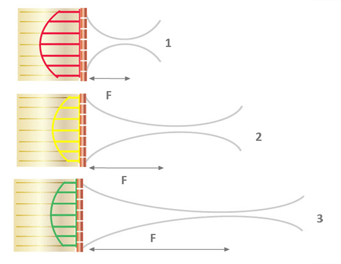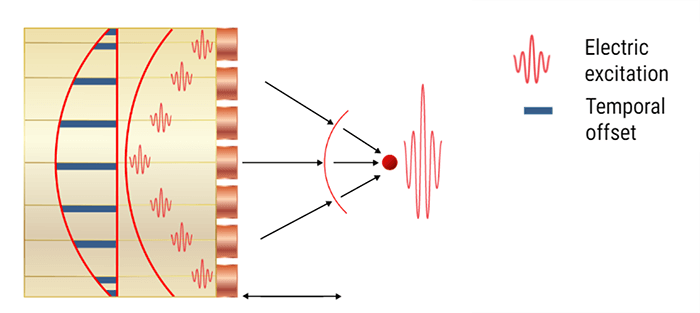 Moving on to the electronic scanning technique, a subset of piezoelectric elements work together to produce the focused beam. Each of the transducers is excited with time offsets. The combination of several focal lengths at the emission improves the quality of the image.