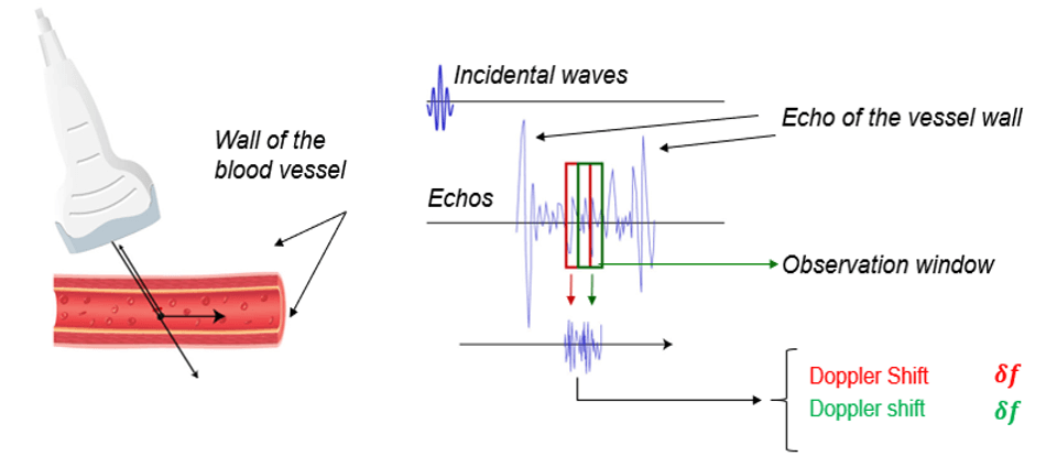 An observation window called the “Doppler window” selects the echoes scattered by the red blood cells moving at a given depth. The velocity of the red blood cells is measured at a specific depth that can be adjusted.