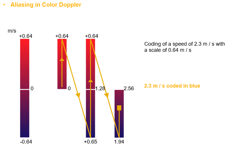 Aliasing occurs when the Doppler shift of the moving blood is higher than half of the pulse repetition frequency. Aliased signals are presented in the wrong direction (blue instead of red and vice versa). In this example the measured speed (2.3 m/s) is greater than half of the Nyquist limit (0.64 m/s), thus instead of being colored in red, it will be presented in blue as if the RCB is moving away from the transducer.